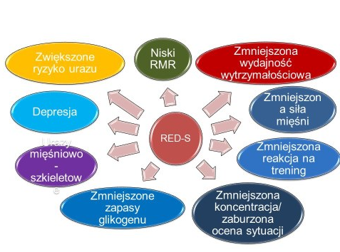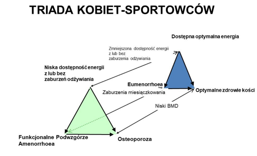 - Zmiany biologiczne (np. obniżone tętno spoczynkowe, obniżone ciśnienie krwi lub zawroty głowy w pozycji stojącej, zmiana składu ciała (utrata masy ciała), niski skład ciała lub BMI <18,5 kg/m2, przetrenowanie, nawracające i nie gojące się urazy, załamanie pod wpływem stresu)